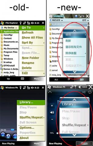 A destra si trovano i nuovi soft-menu di Windows Mobile 6.5 mentre a sinistra quelli di Windows Mobile 6.1