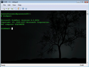 Da ora comincia la parte delicata e quindi state attenti a quello che fate. Scrivete "diskpart" sul terminale. Vi apparirà un nuovo prompt come questo: