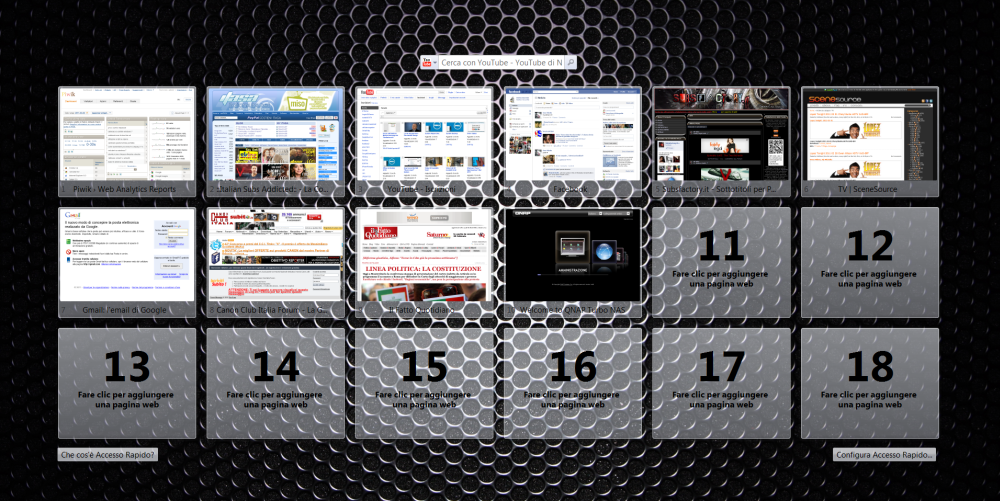 Chiudete quindi Opera e andate nella cartella "C:\Users\<vostro username>\AppData\Roaming\Opera\Opera" e aprite il file speeddial.ini. Alla fine di questo file troverete le dimensioni, inserite quello che più preferite. Io ad esempio ho settato un 6x3, e questo è il risultato ottenuto: